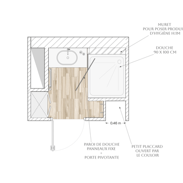 Espace multiplié : On proposera diviser l'espace de l'ancienne baignoire, d'une part la douche et de l'autre coté de la cloison un petit placard accessible depuis le couloir.